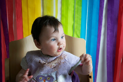 Because I am crazy, I decided to be a little bit ambitious. Nothing extravagant, but we know so many other babies around the same age. So I invited six of them, with their parents of course, plus family and friends. I planned 2 cakes, one chocolate zucchini one chai, both iced with stabilized whipping cream and joined by an edible rainbow, jars of rainbow candy, a fruit rainbow. Music by the ever-talented Grampa Don. A crepe paper rainbow wall, personalized loot bags for each baby, a WHITE dress, if you please, with a rainbow sash, for the birthday girl.